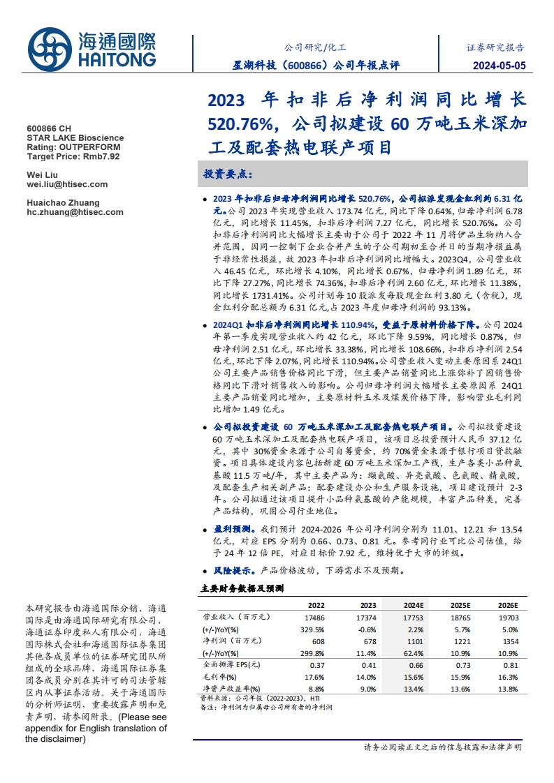 2024-05-06-海通國際-星湖科技-公司年報(bào)點(diǎn)評:2023年扣非后凈利潤同比增長520.76%,公司擬建設(shè)60萬噸玉米深加工及配套熱電聯(lián)產(chǎn)項(xiàng)目