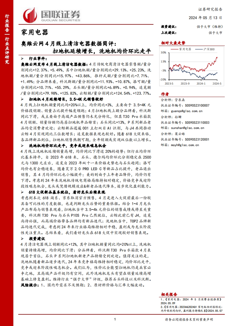 2024-05-13-國聯(lián)證券--奧維云網(wǎng)4月線上清潔電器數(shù)據(jù)簡評:掃地機(jī)延續(xù)增長,洗地機(jī)均價(jià)環(huán)比走平