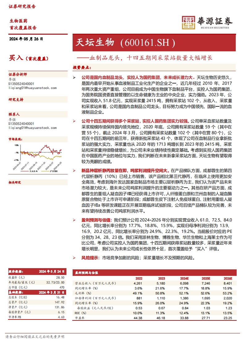 2024-05-26-華源證券-天壇生物-血制品龍頭,十四五期間采漿站數(shù)量大幅增長(zhǎng)