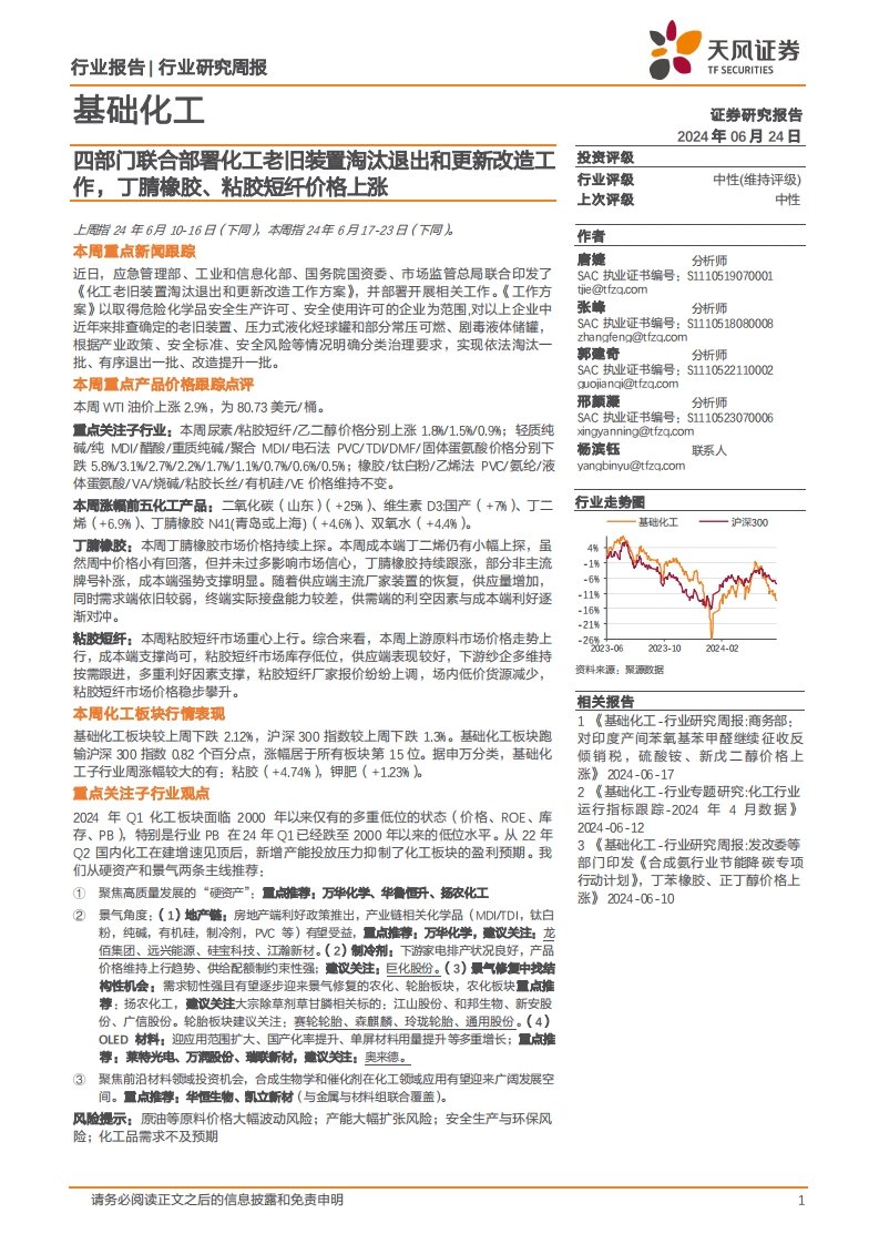 2024-06-24-天風(fēng)證券--基礎(chǔ)化工行業(yè)報(bào)告:四部門聯(lián)合部署化工老舊裝置淘汰退出和更新改造工作,丁腈橡膠、粘膠短纖價(jià)格上漲