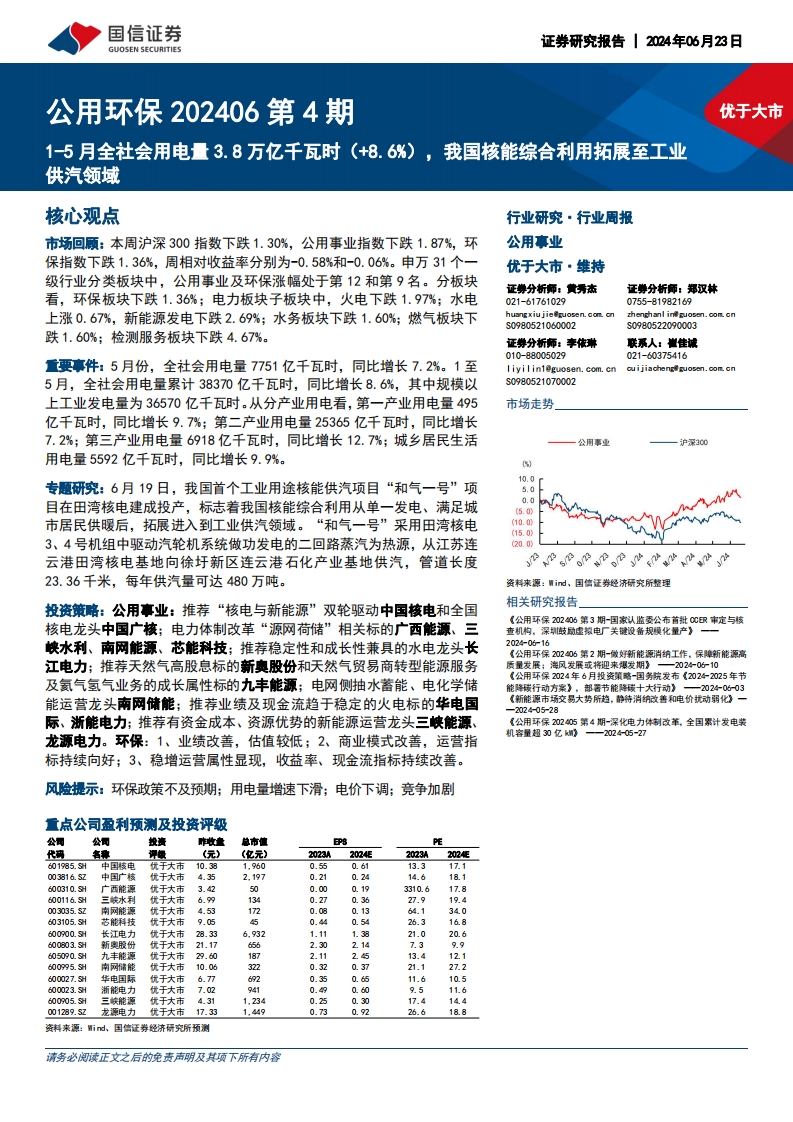 2024-06-24-國(guó)信證券--公用環(huán)保行業(yè)202406第4期:1-5月全社會(huì)用電量3.8萬(wàn)億千瓦時(shí)(+8.6%),我國(guó)核能綜合利用拓展至工業(yè)供汽領(lǐng)域