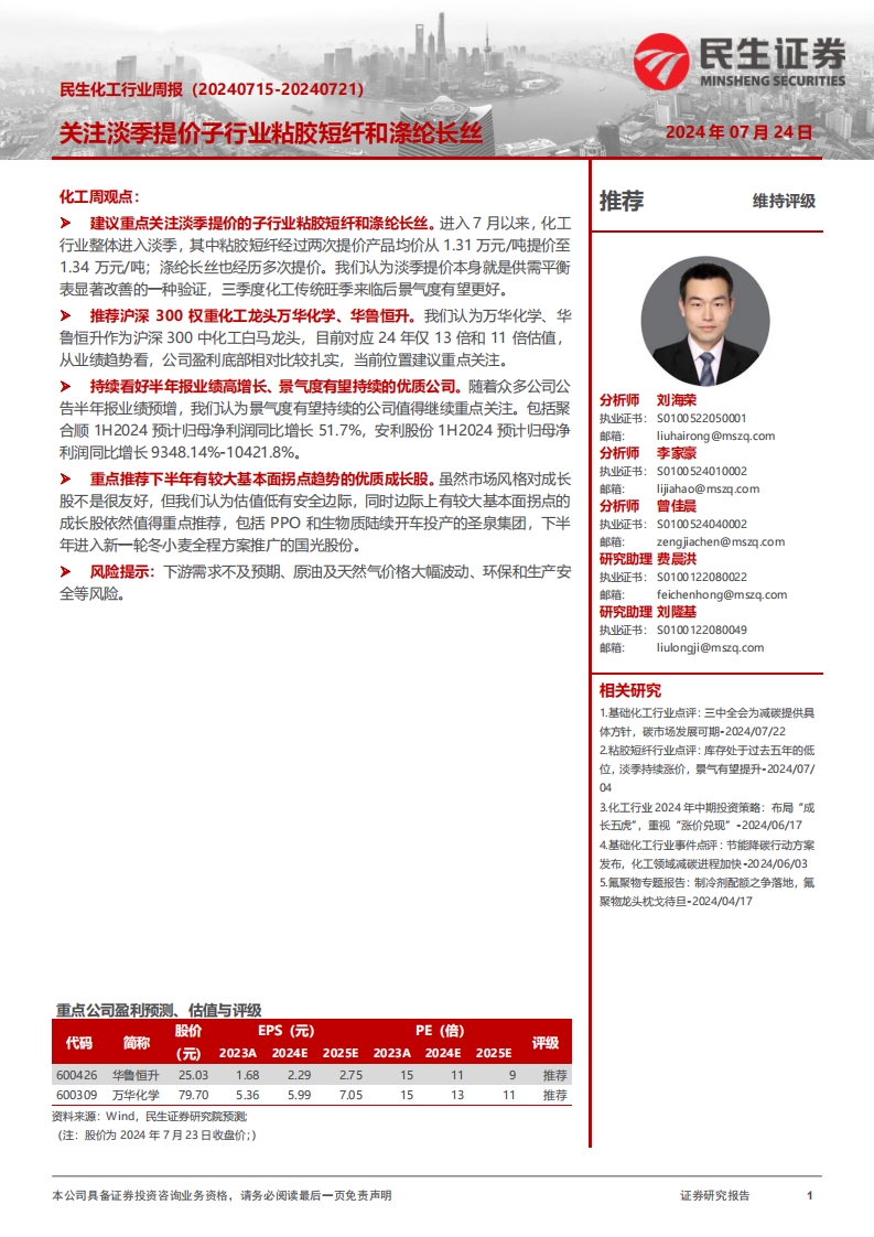 2024-07-24-民生證券--民生化工行業(yè)周報:關注淡季提價子行業(yè)粘膠短纖和滌綸長絲