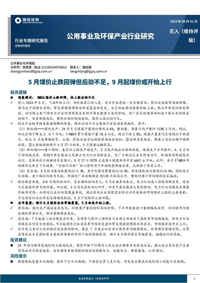 2024-08-01-國金證券--公用事業(yè)及環(huán)保產(chǎn)業(yè)行業(yè)研究:5月煤價(jià)止跌回彈但后勁不足,9月起煤價(jià)或開始上行
