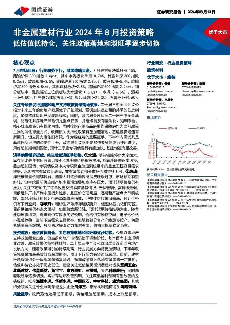 2024-08-14-國信證券-非金屬建材行業(yè)2024年8月投資策略:低估值低持倉,關(guān)注政策落地和淡旺季逐步切換