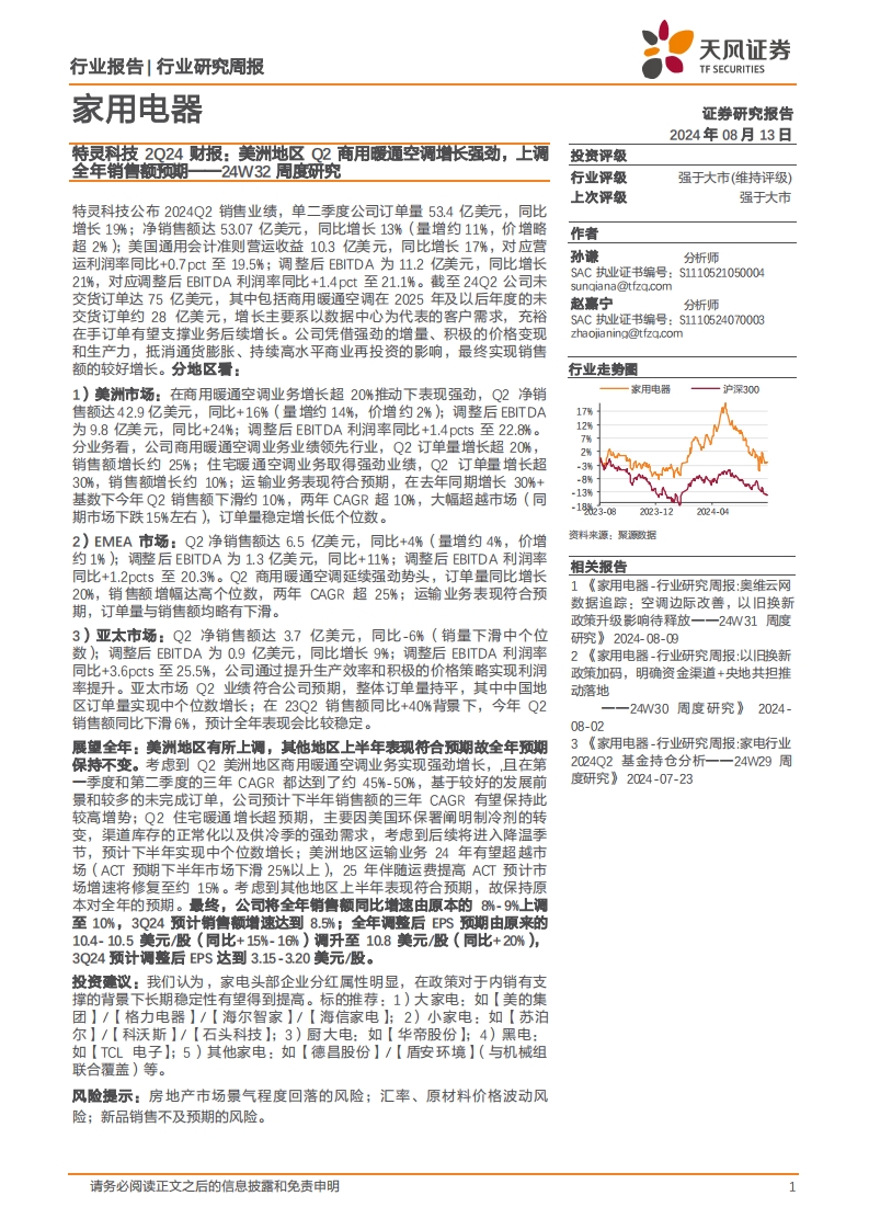 2024-08-14-天風證券--家用電器行業(yè)24W32周度研究:特靈科技2Q24財報,美洲地區(qū)Q2商用暖通空調增長強勁,上調全年銷售額預期