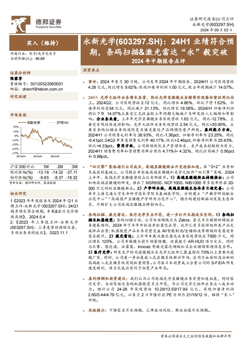 2024-09-03-德邦證券-永新光學(xué)-2024年中期報(bào)告點(diǎn)評(píng):24H1業(yè)績(jī)符合預(yù)期,條碼掃描&激光雷達(dá)“永”毅突破