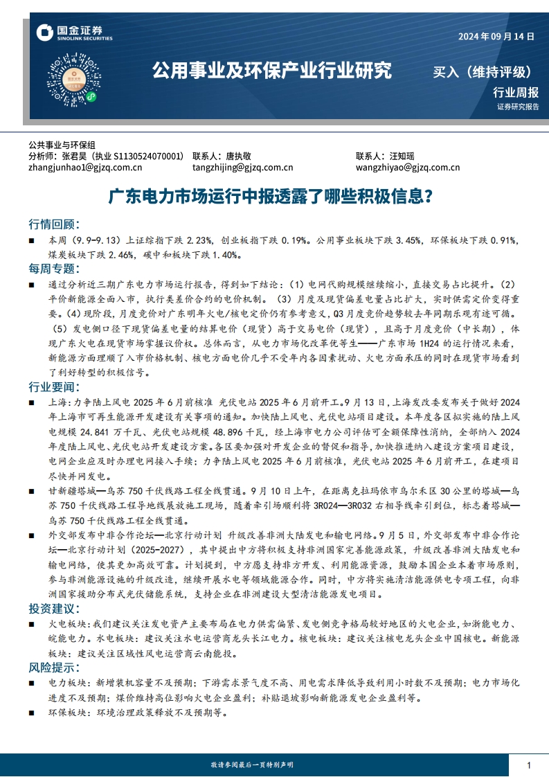 2024-09-16-國金證券--公用事業(yè)及環(huán)保產業(yè)行業(yè)研究:廣東電力市場運行中報透露了哪些積極信息?