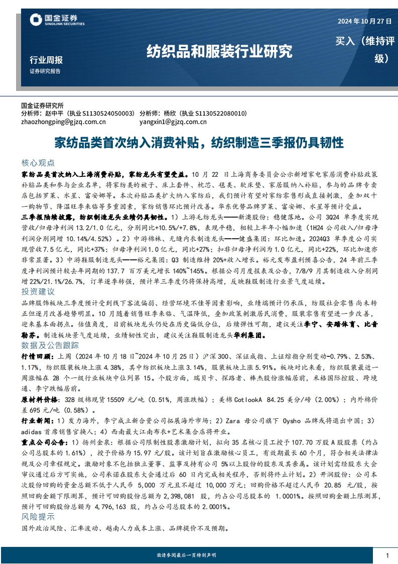2024-10-28-國金證券--紡織品和服裝行業(yè)周報(bào):家紡品類首次納入消費(fèi)補(bǔ)貼,紡織制造三季報(bào)仍具韌性