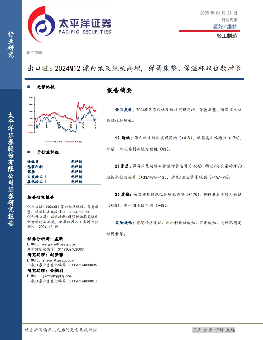 2025-01-22-太平洋--輕工制造行業(yè)周報:出口鏈,2024M12漂白紙及紙板高增,彈簧床墊、保溫杯雙位數(shù)增長