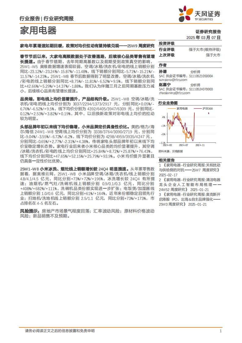 2025-03-07-天風(fēng)證券--家用電器行業(yè)25W9周度研究:家電年累增速如期回暖,政策對(duì)均價(jià)拉動(dòng)有望持續(xù)兌現(xiàn)