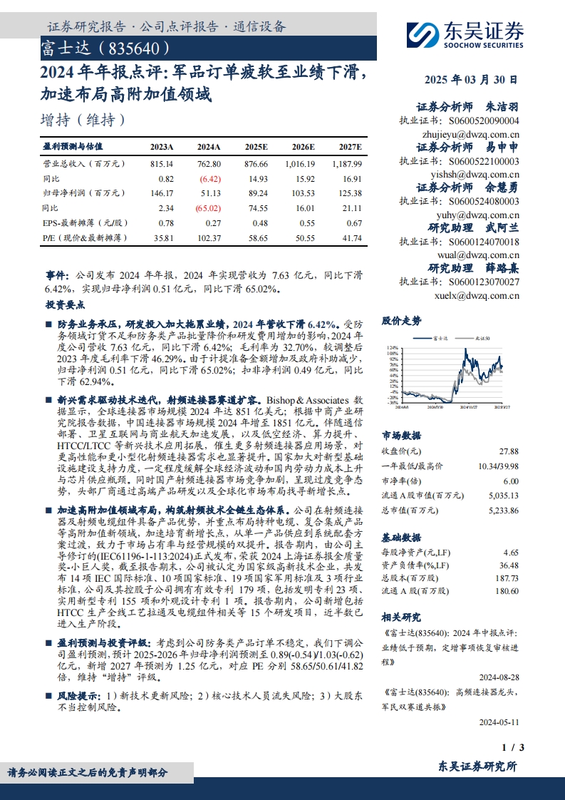 2025-03-30-東吳證券-富士達(dá)-2024年年報(bào)點(diǎn)評(píng):軍品訂單疲軟至業(yè)績(jī)下滑加速布局高附加值領(lǐng)域