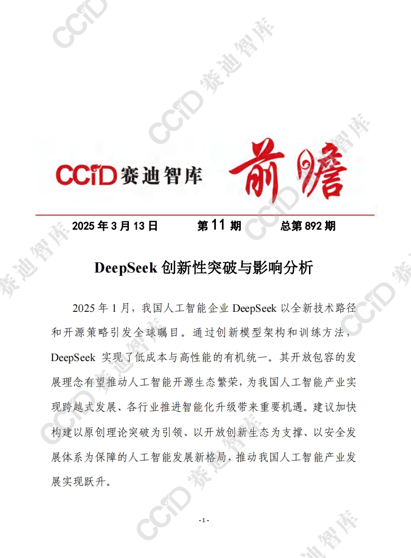 賽迪前瞻2025年第11期(總892期):DeepSeek創(chuàng)新性突破與影響分析 - 水印版