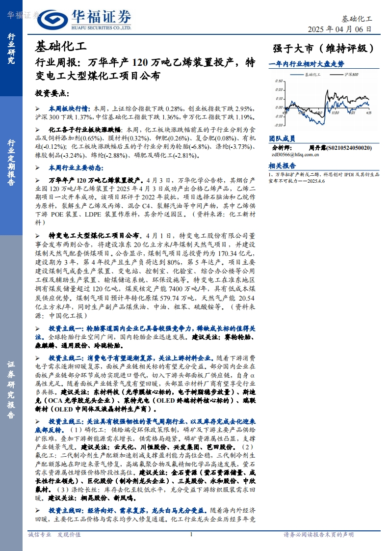 2025-04-06-華福證券--基礎(chǔ)化工行業(yè)周報:萬華年產(chǎn)120萬噸乙烯裝置投產(chǎn),特變電工大型煤化工項目公布