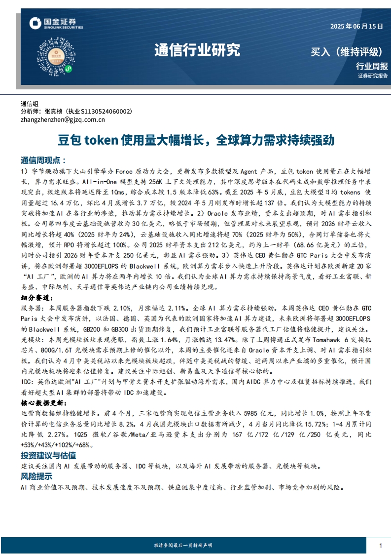 2025-06-16-國(guó)金證券--通信行業(yè)周報(bào):豆包token使用量大幅增長(zhǎng),全球算力需求持續(xù)強(qiáng)勁