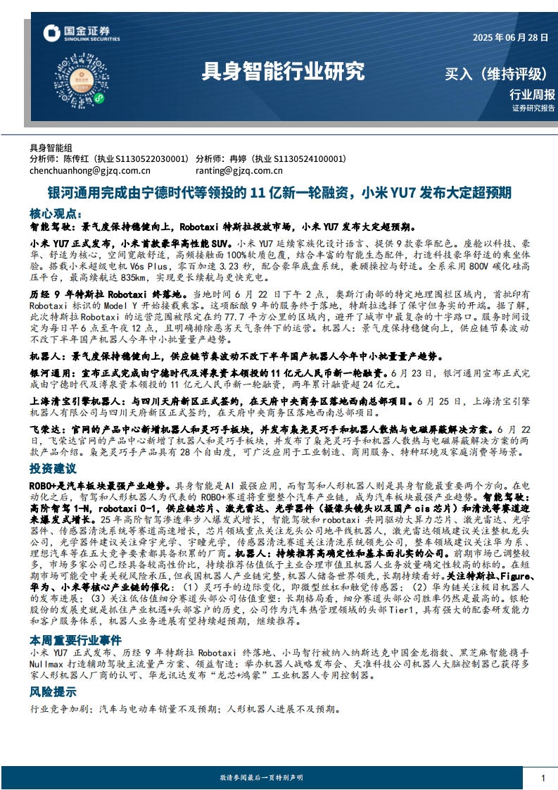 2025-06-30-國(guó)金證券--具身智能行業(yè)研究:銀河通用完成由寧德時(shí)代等領(lǐng)投的11億新一輪融資,小米YU7發(fā)布大定超預(yù)期