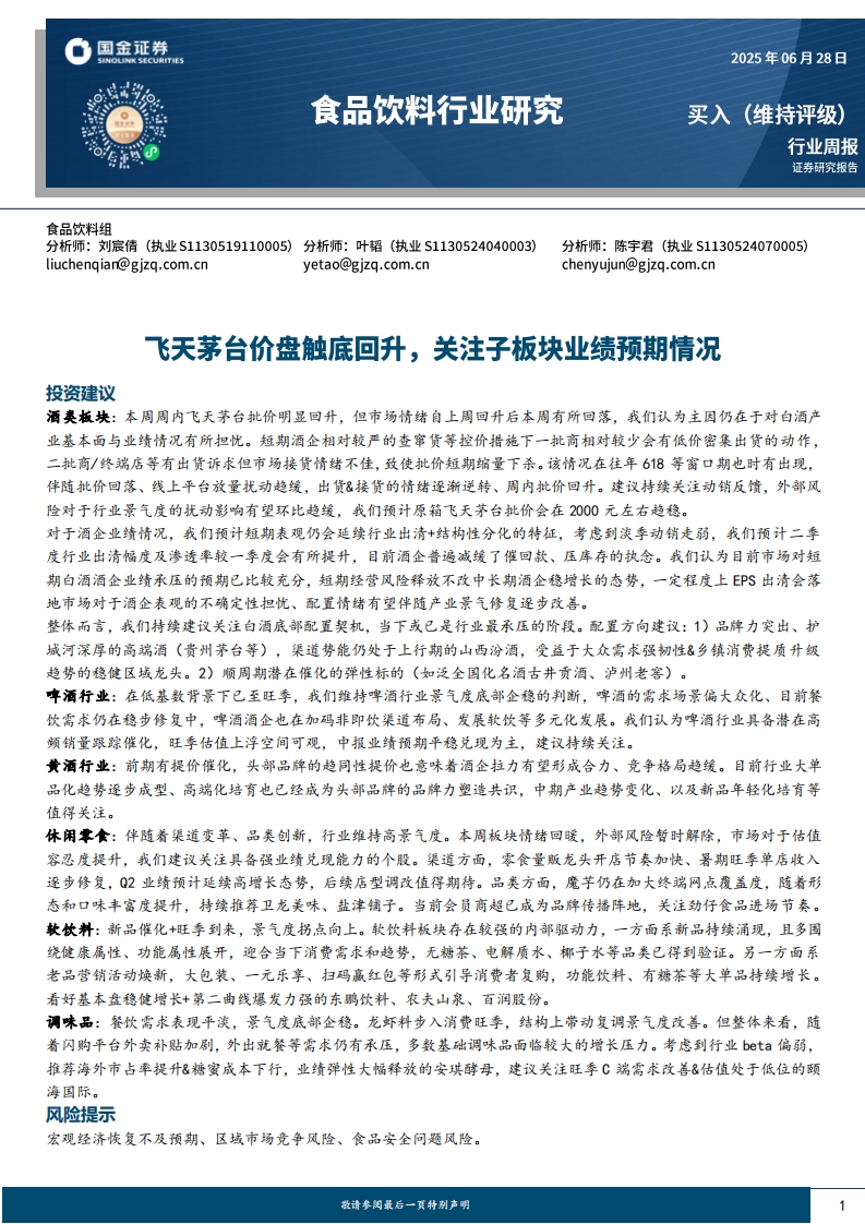 2025-06-29-國金證券--食品飲料行業(yè)研究:飛天茅臺(tái)價(jià)盤觸底回升,關(guān)注子板塊業(yè)績預(yù)期情況