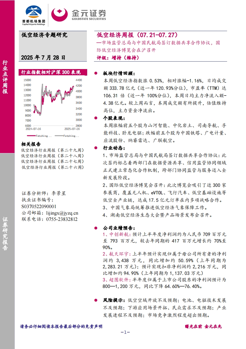 2025-07-29-金元證券--低空經(jīng)濟周報:市場監(jiān)管總局與中國民航局簽訂數(shù)據(jù)共享合作協(xié)議,國際低空經(jīng)濟博覽會在滬召開