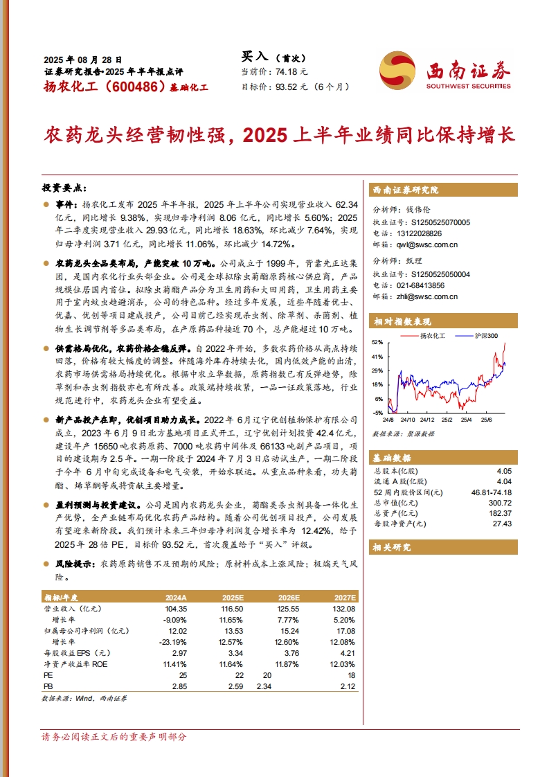 2025-08-29-西南證券-揚農(nóng)化工-2025年半年報點評:農(nóng)藥龍頭經(jīng)營韌性強,2025上半年業(yè)績同比保持增長