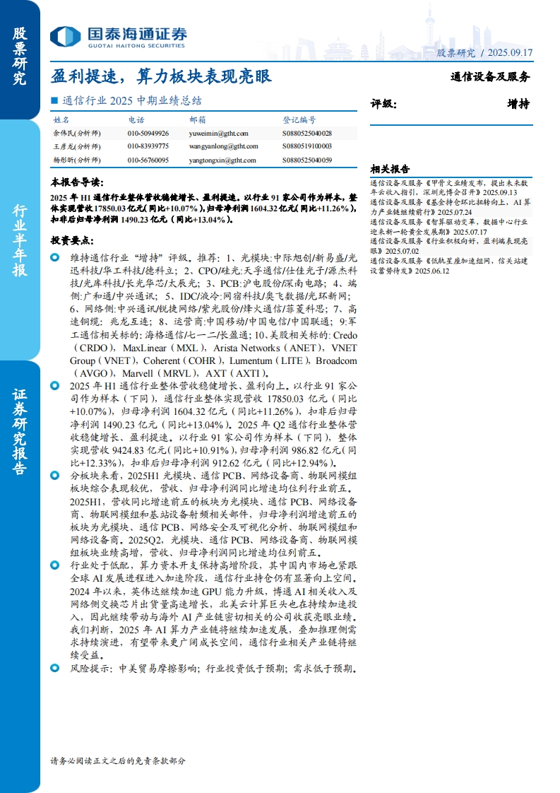 通信行業(yè)2025中期業(yè)績(jī)總結(jié):盈利提速,算力板塊表現(xiàn)亮眼