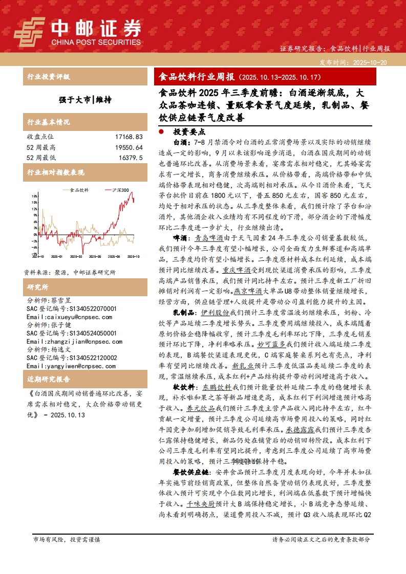 2025-10-20-中郵證券--食品飲料行業(yè)周報(bào)-食品飲料2025年三季度前瞻:白酒逐漸筑底,大眾品茶咖連鎖、量販零食景氣度延續(xù),乳制品、餐飲供應(yīng)鏈景氣度改善