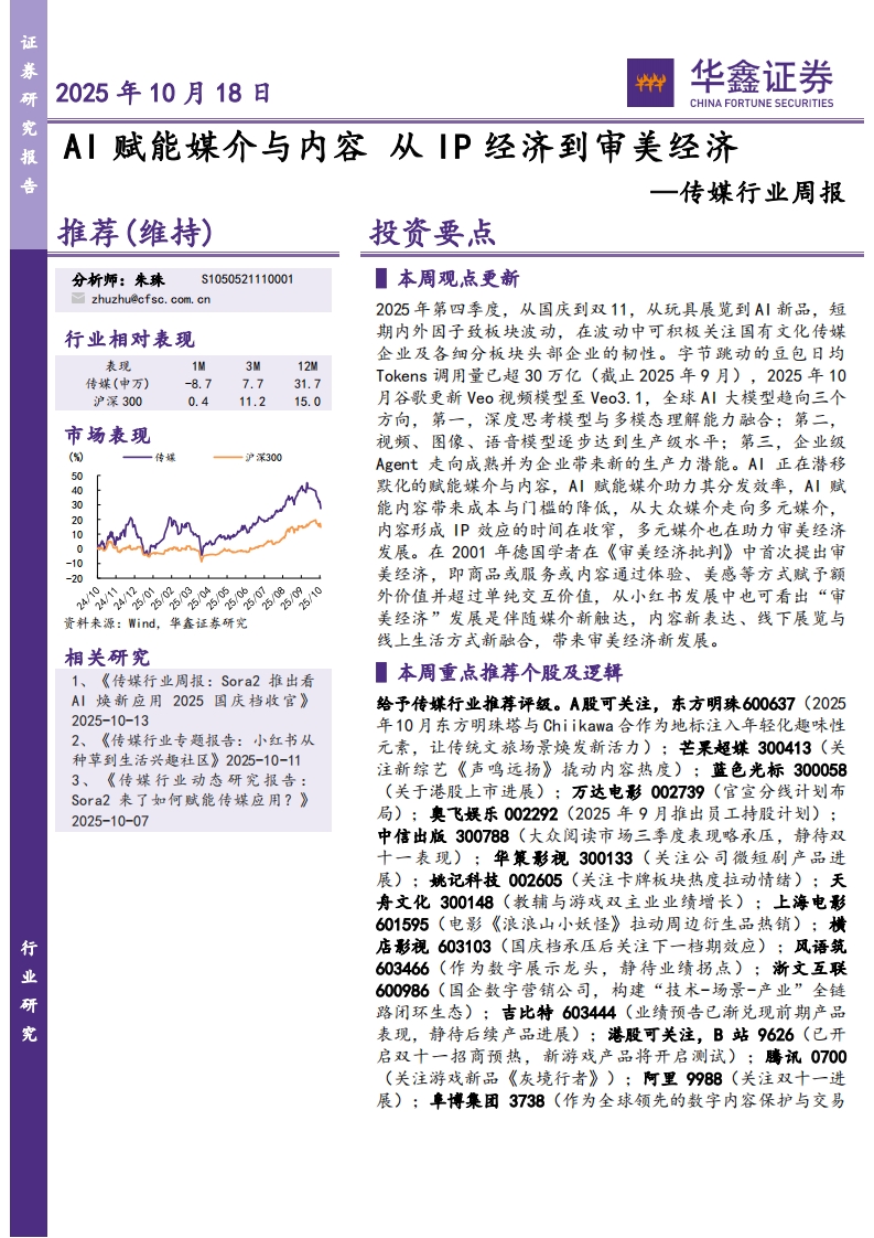 2025-10-19-華鑫證券--傳媒行業(yè)周報(bào):AI賦能媒介與內(nèi)容從IP經(jīng)濟(jì)到審美經(jīng)濟(jì)