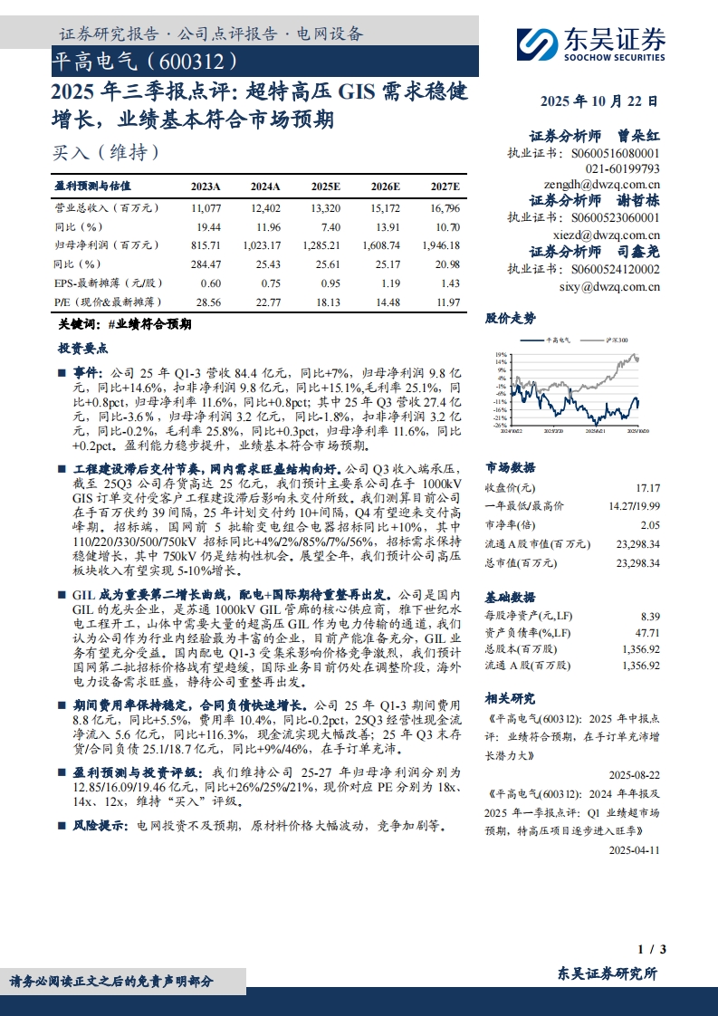 2025-10-22-東吳證券-平高電氣-2025年三季報點評:超特高壓GIS需求穩(wěn)健增長,業(yè)績基本符合市場預期