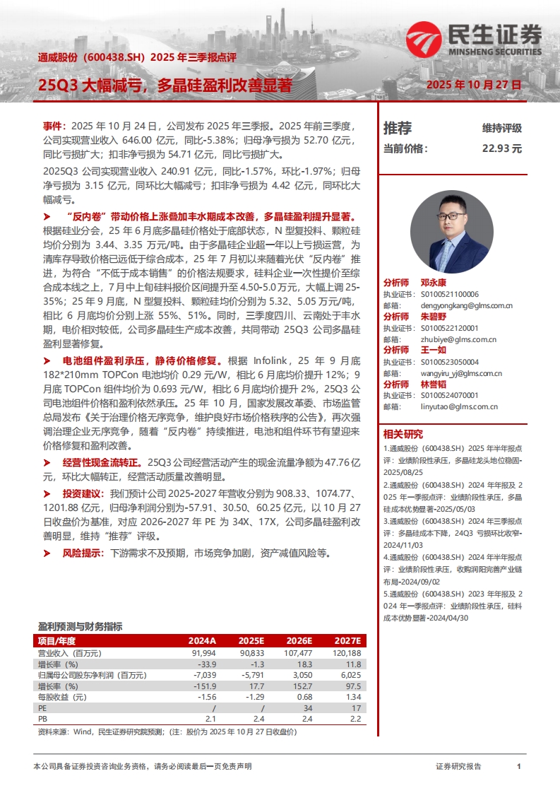 2025-10-27-民生證券-通威股份-2025年三季報(bào)點(diǎn)評:25Q3大幅減虧,多晶硅盈利改善顯著