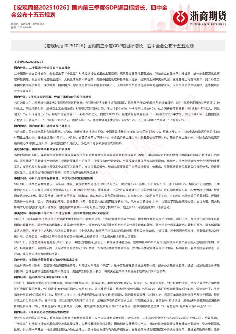 2025-10-27-浙商期貨-【宏觀周報】國內(nèi)前三季度GDP超目標(biāo)增長,四中全會公布十五五規(guī)劃