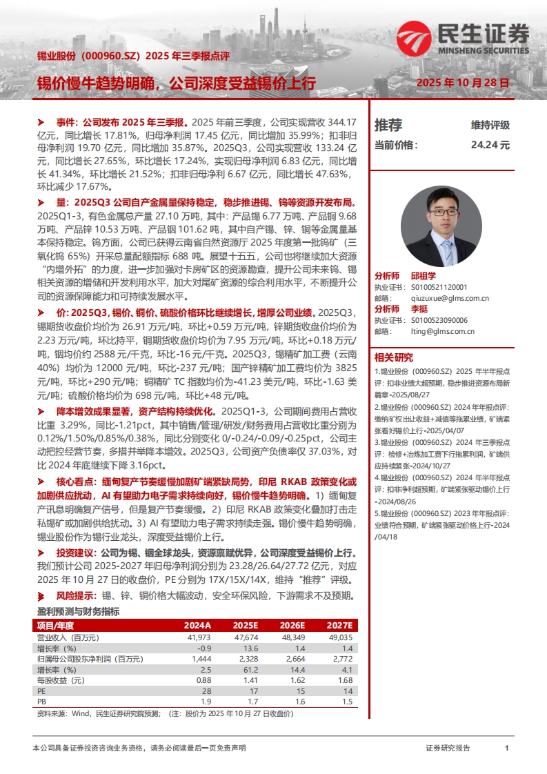 2025-10-28-民生證券-錫業(yè)股份-2025年三季報(bào)點(diǎn)評(píng):錫價(jià)慢牛趨勢(shì)明確,公司深度受益錫價(jià)上行