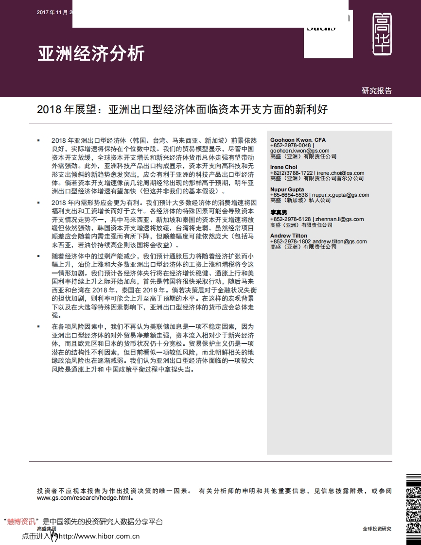 20171126-:-高盛高華證券-亞洲經(jīng)濟分析-2018年展望,亞洲出口型經(jīng)濟體面臨資本開支方面的新利好-20頁