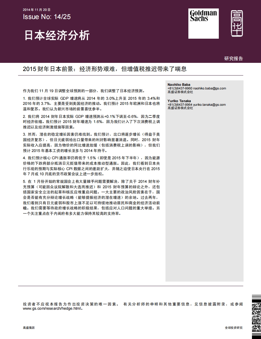 20141120-華為:-高盛高華證券-日本經(jīng)濟分析2015財年日本前景-經(jīng)濟形勢艱難,但增值稅推遲帶來了喘息-12頁
